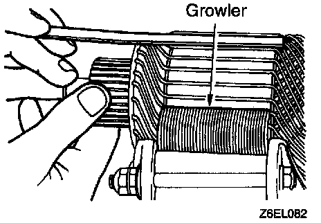 2. Hold a thin steel blade parallel and just above while rotating armature slowly in growler. A shorted armature will cause blade to vibrate and be attracted to the core. Replace shorted armature.