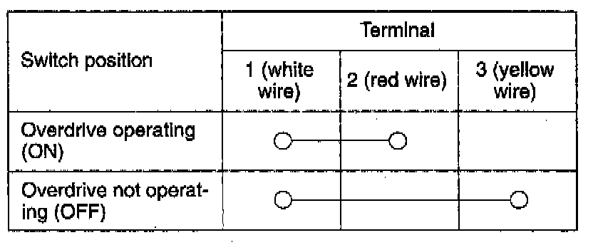 Check for continuity as indicated in the test chart above. If the switch does not indicate the proper continuity for each switch position, replace the Overdrive Switch.