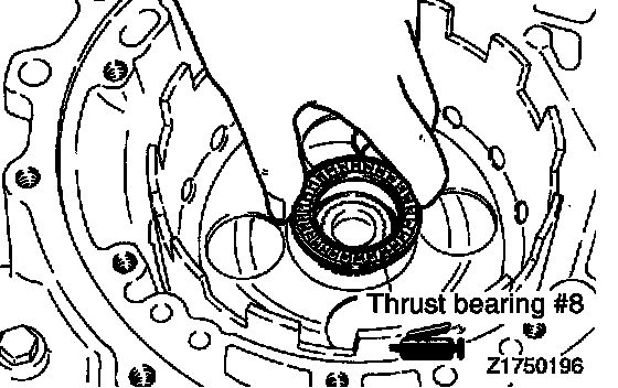 39. Apply petrolatum jelly to thrust bearing # 8 and attach the thrust bearing to the kickdown drum.
