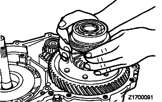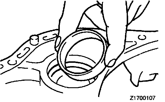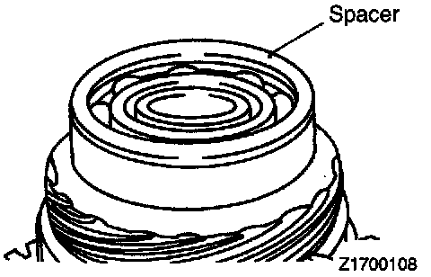 58. Place the spacer for the transfer shaft which was selected in step 57 in the transfer shaft bearing hole in the converter housing, and insert the bearing outer race in the case.