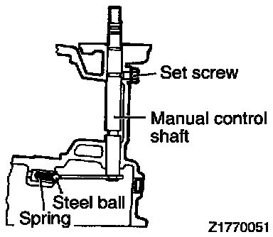 64. After installing a new O-ring on the manual control shaft assembly, draw the shaft back into the case, then install the set screw and gasket. Also install the detent steel ball, seat and spring at the same time.