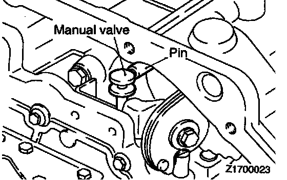 70. Install the valve body in the transaxle case while fitting the detent plate pin in the gap between the lands of the manual valve.