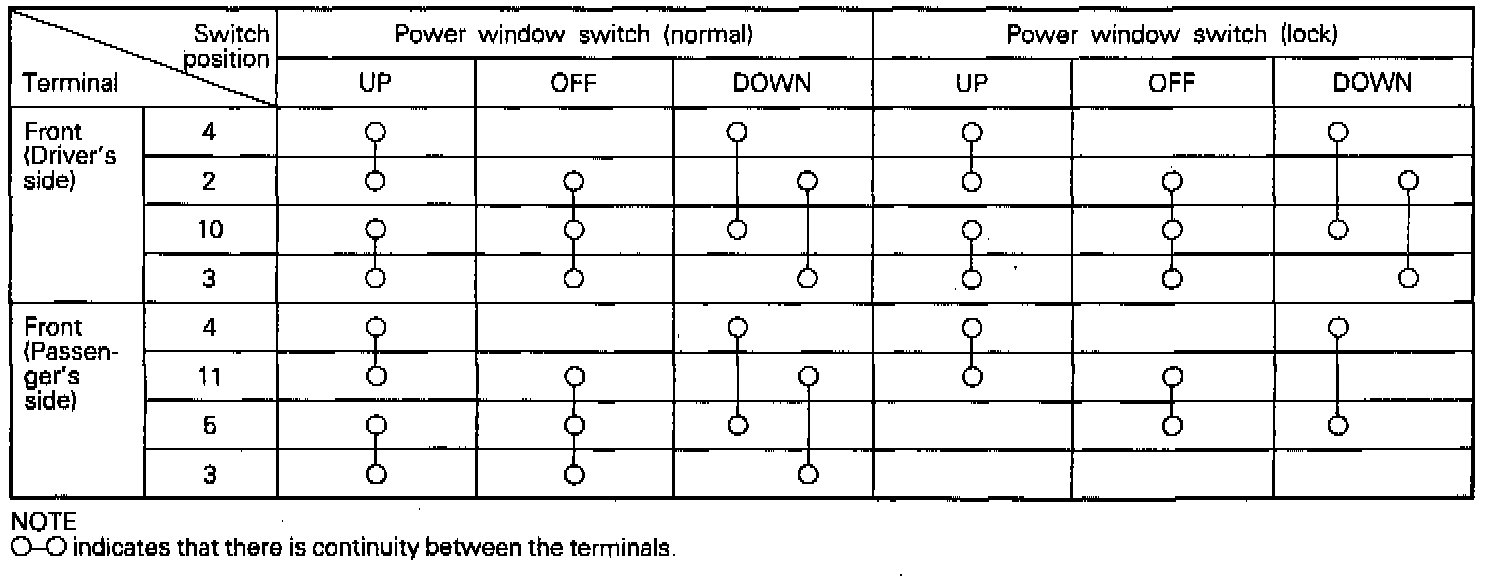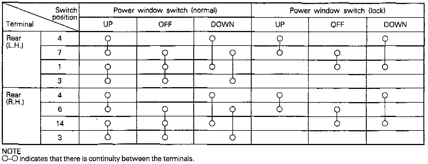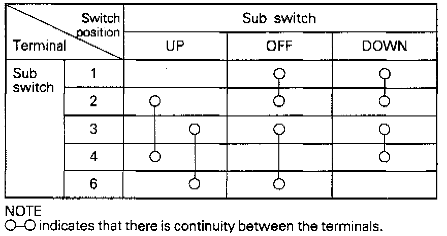 Operate the switch and check continuity between the terminals as indicated in the charts below.