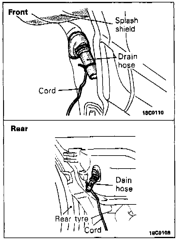 Tie a cord at the end of the drain hose and pull out the drain hose toward the vehicle interior.