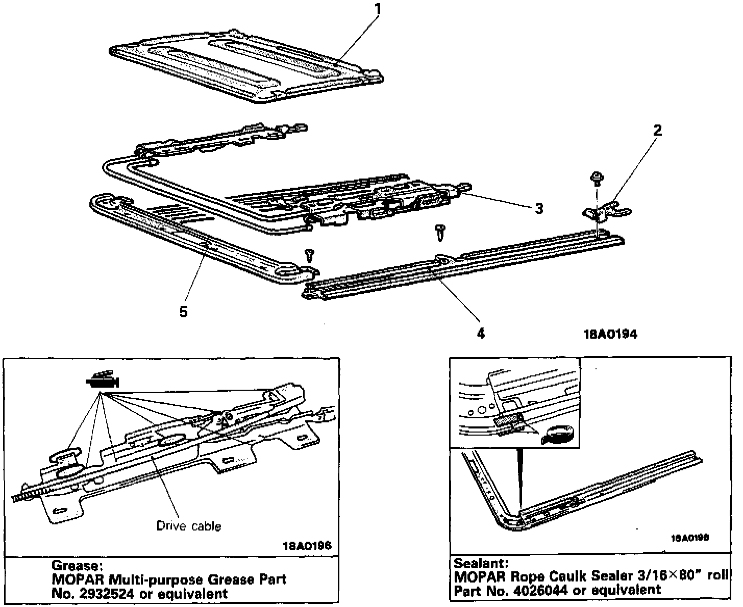 Specified adhesive: MOPAR Rope Caulk Sealer 3/16 x 80" roll Part No. 4026044 or equivalent