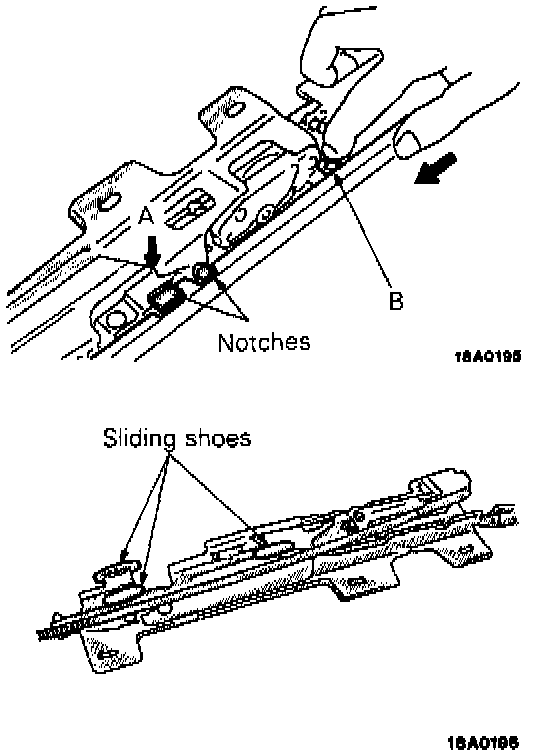 Pull out the sliding roof drive cable assembly from the rear part of the guide rail. If it won't slide (with the notches of the guide rail as indicated in the illustration), press the (A) part and, with a finger at the (B) part, slide toward the rear.