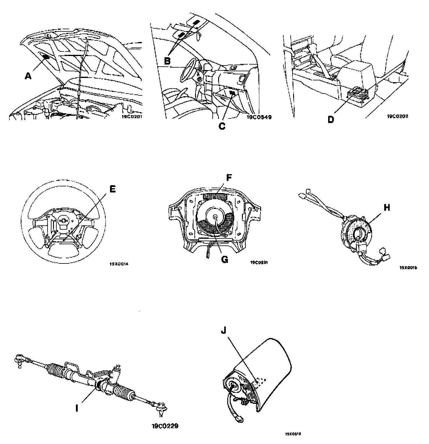 A number of caution labels relating to the SRS are found in the vehicle, as shown in the following illustration. Follow label instructions when servicing SRS.