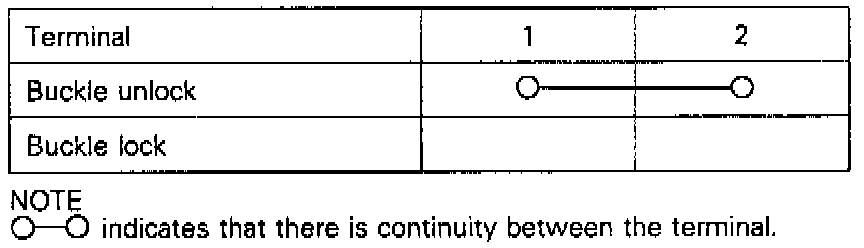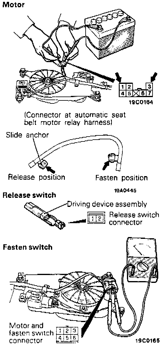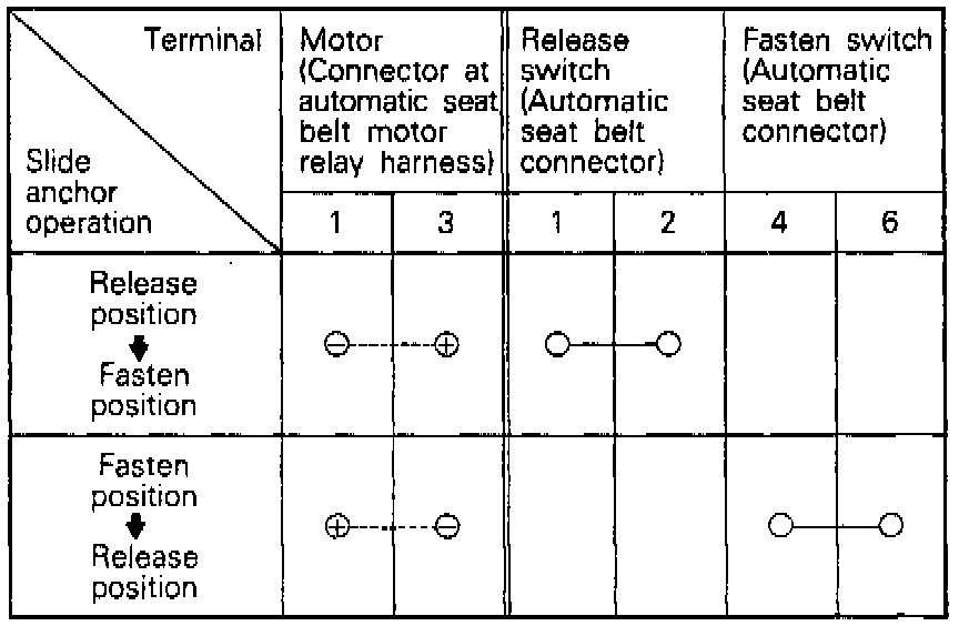 2. Connect the battery to the connector (shown in the figure) at the automatic seat belt motor relay harness side, and, as shown in the table below, check to be sure that the slide anchor functions normally, and also check for continuity of each switch.