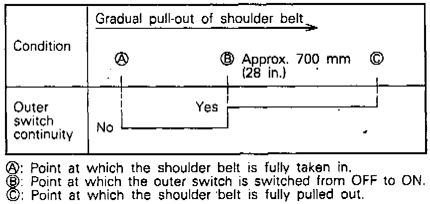 2. Check for continuity between terminals when the shoulder belt is pulled out approximately 700 mm (28 in.) or more.