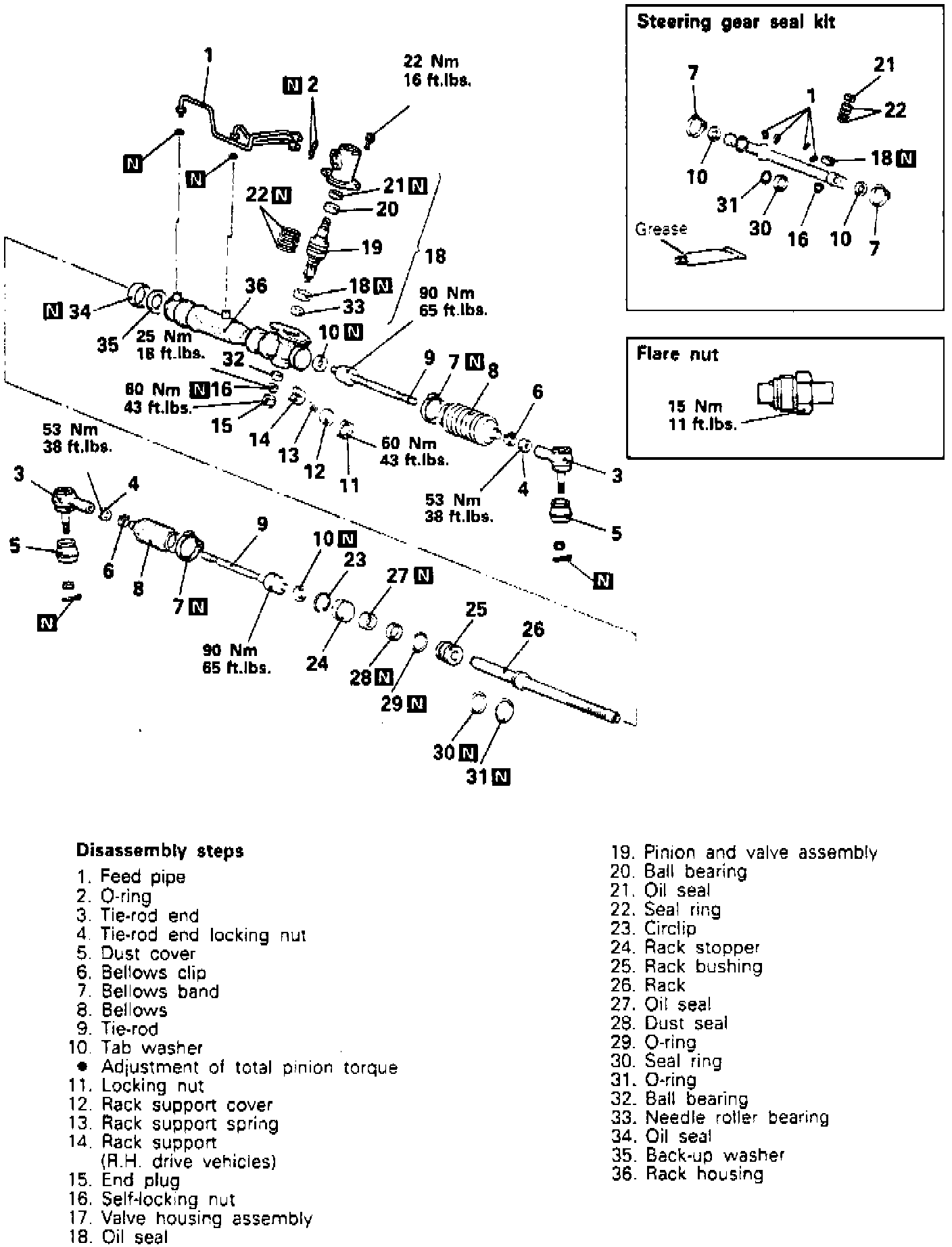 Disassemble rack and pinion in numbered sequence shown, noting the following: