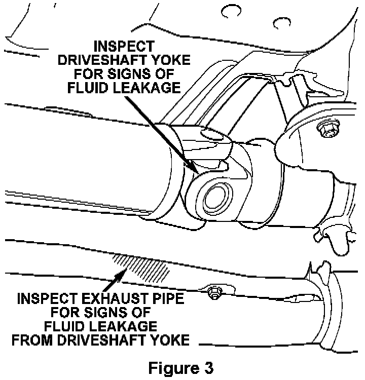 5. Inspect the driveshaft yoke plug and front exhaust pipe (Figure 3) for signs of oil leakage. If signs of leakage from the yoke are evident, the driveshaft yoke must be replaced.