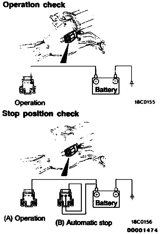 2. Reconnect the battery as shown in the illustration, and confirm that after the motor starts turning at LOW speed, it stops at the automatic stop position.