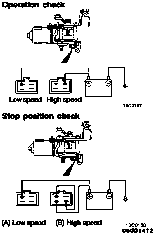 Connect a battery to the wiper motor as shown in the illustration and inspect motor operation at LOW speed and HIGH speed.