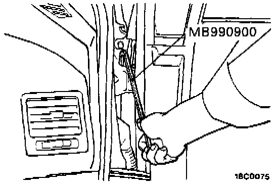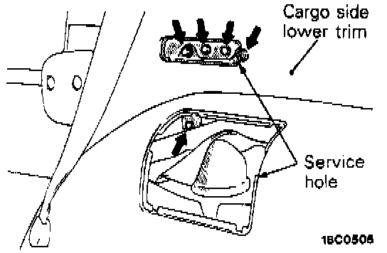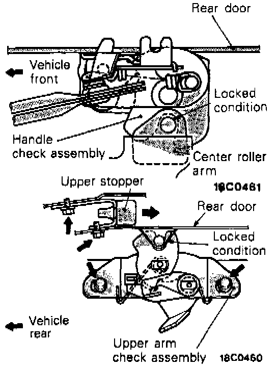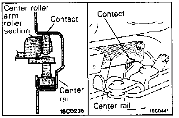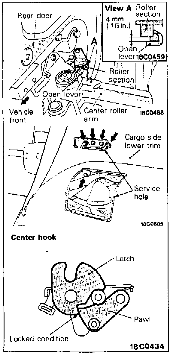 NOTE: After adjustment, remove the rear door upper trim, and check to be sure that the roller part of the center roller arm comes in contact with the center rail.