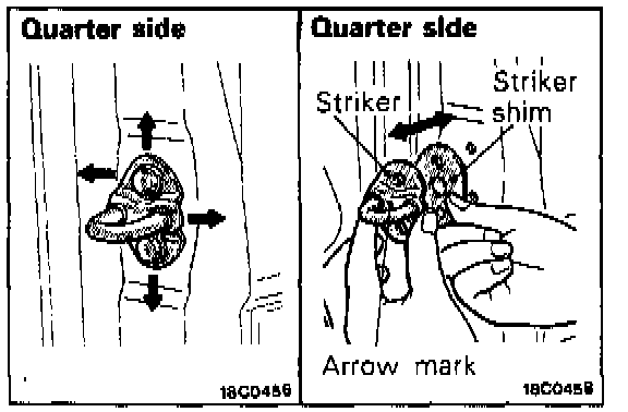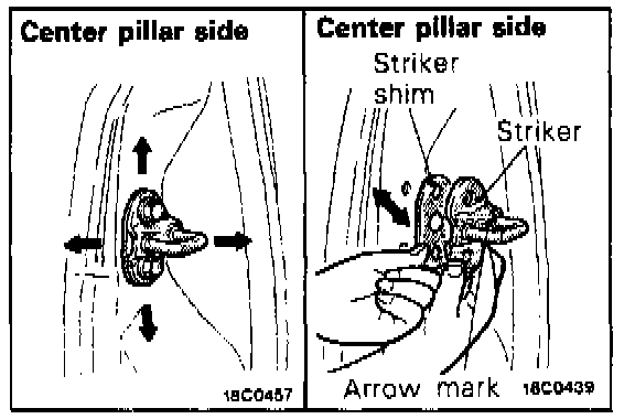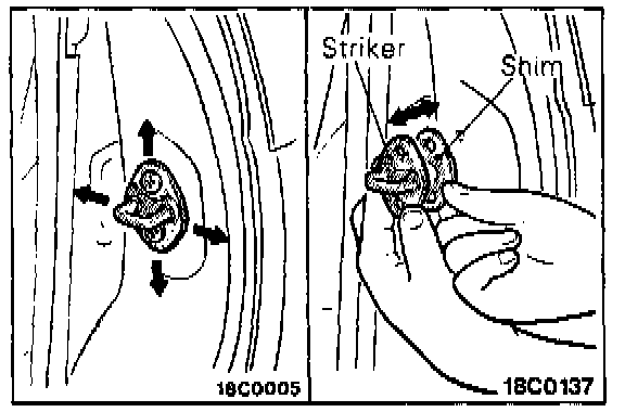 If the door opening and closing is stiff, adjust the linking of the striker and the door latch using the shim, while moving the striker up and down, or left and right.