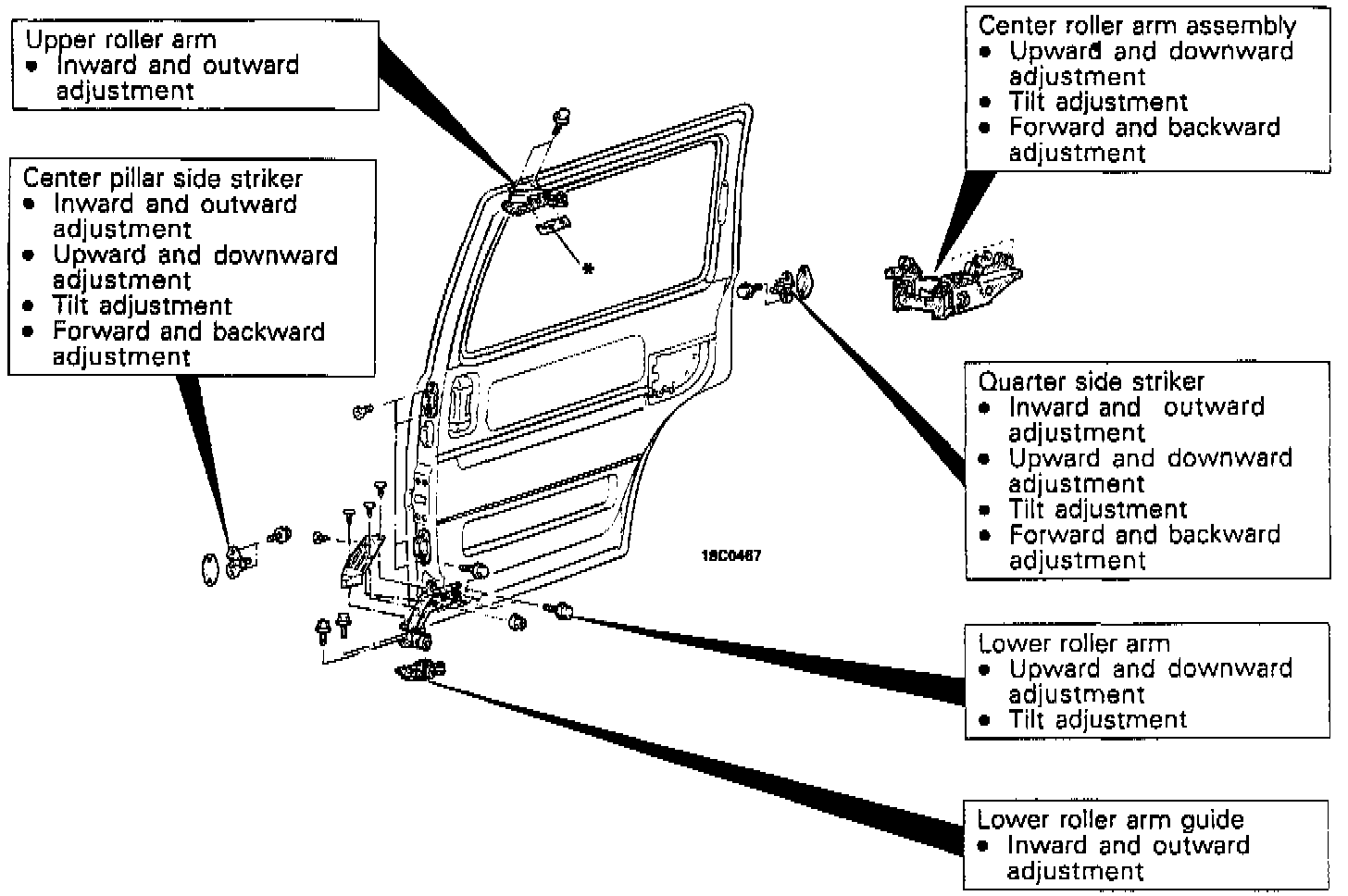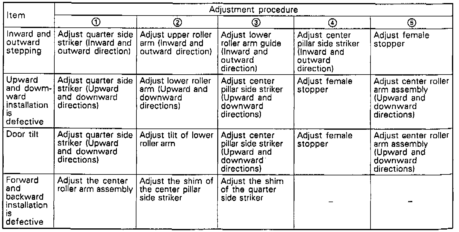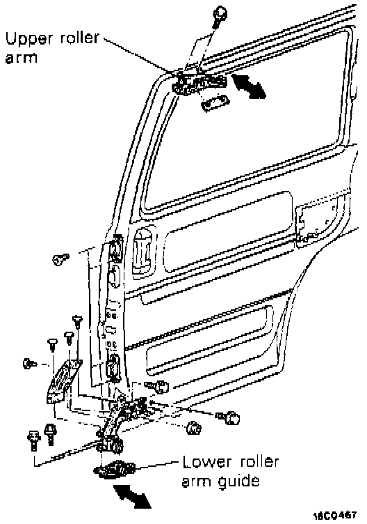 When the door is protruding into the body, adjust by loosening the mounting bolts of the upper roller arm and lower roller arm guides, and moving the upper roller arm and lower roller arm guides towards the inside of the vehicle. If the door is sticking out of the body, move the upper roller arm and lower roller arm guides in the opposite direction towards the outside of the vehicle.