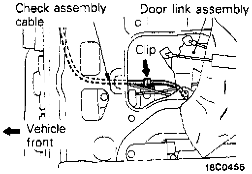 1. Remove the rear door upper trim and check to be sure that the position of the check assembly cable marking and the clip shown in the illustration are aligned.