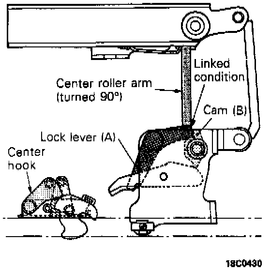 a. Check to be sure that the lock lever (A) and cam (B) are linked when the center hook roller is contacting the lock lever (A).