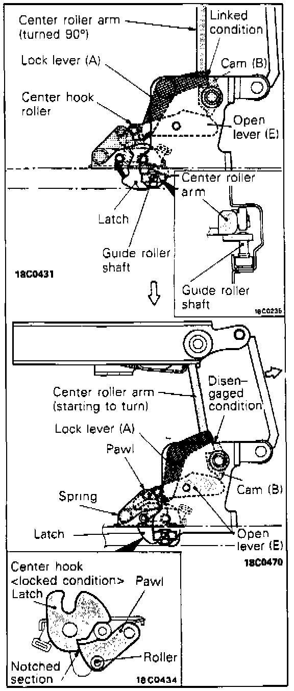 b. At this time, check to be sure that the center hook latch is linked to the guide roller shaft of the center roller arm, and that it starts to turn.