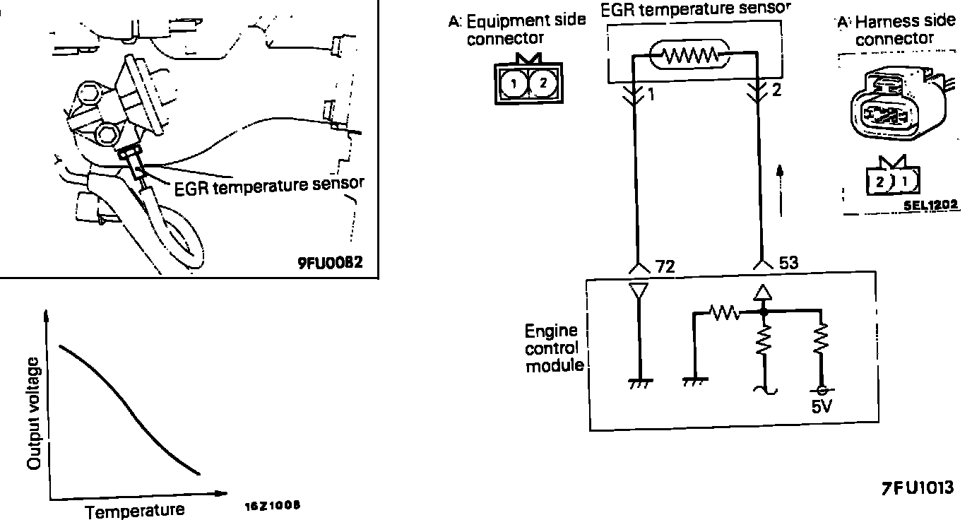 EGR temperature sensor terminal voltage increases or decreases with EGR temperature sensor resistance. Therefore, EGR temperature sensor terminal voltage changes with EGR gas temperature. The higher the EGR gas temperature, the lower the EGR temperature sensor terminal voltage.