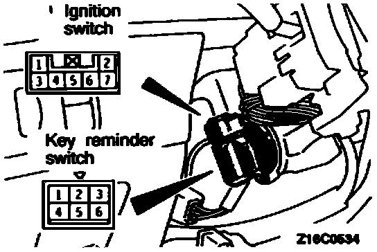 2. Disconnect the wiring connector from the ignition switch and key reminder switch, and connect an ohmmeter to the switch side connector.