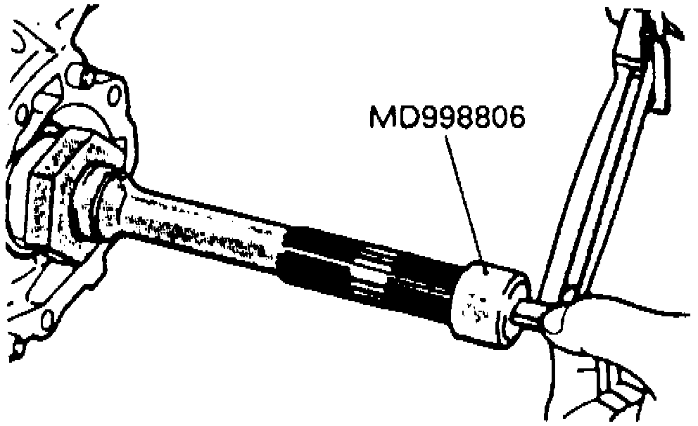 c. Using wrench adapter tool No. MD998806 and suitable torque wrench, or equivalents, check turning torque of the driven bevel gear assembly as shown. If turning torque is not within 0.72-1.23 ft. lbs., adjust with adjusting spacer.