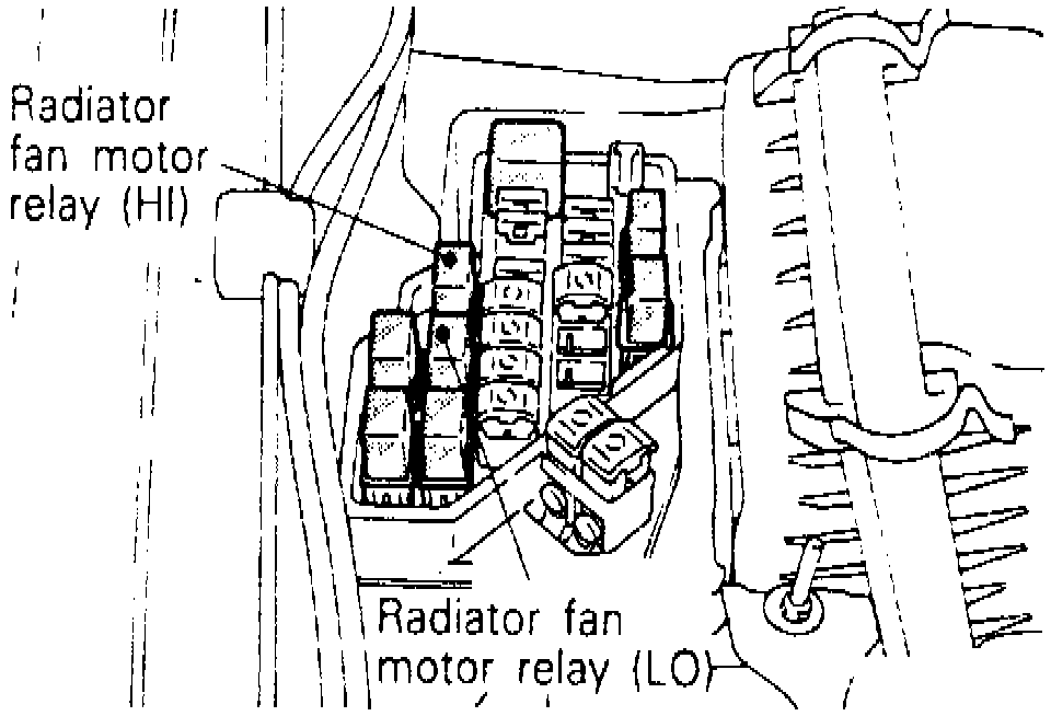 1. Remove radiator fan motor HI and LO relays from relay box located in engine compartment.