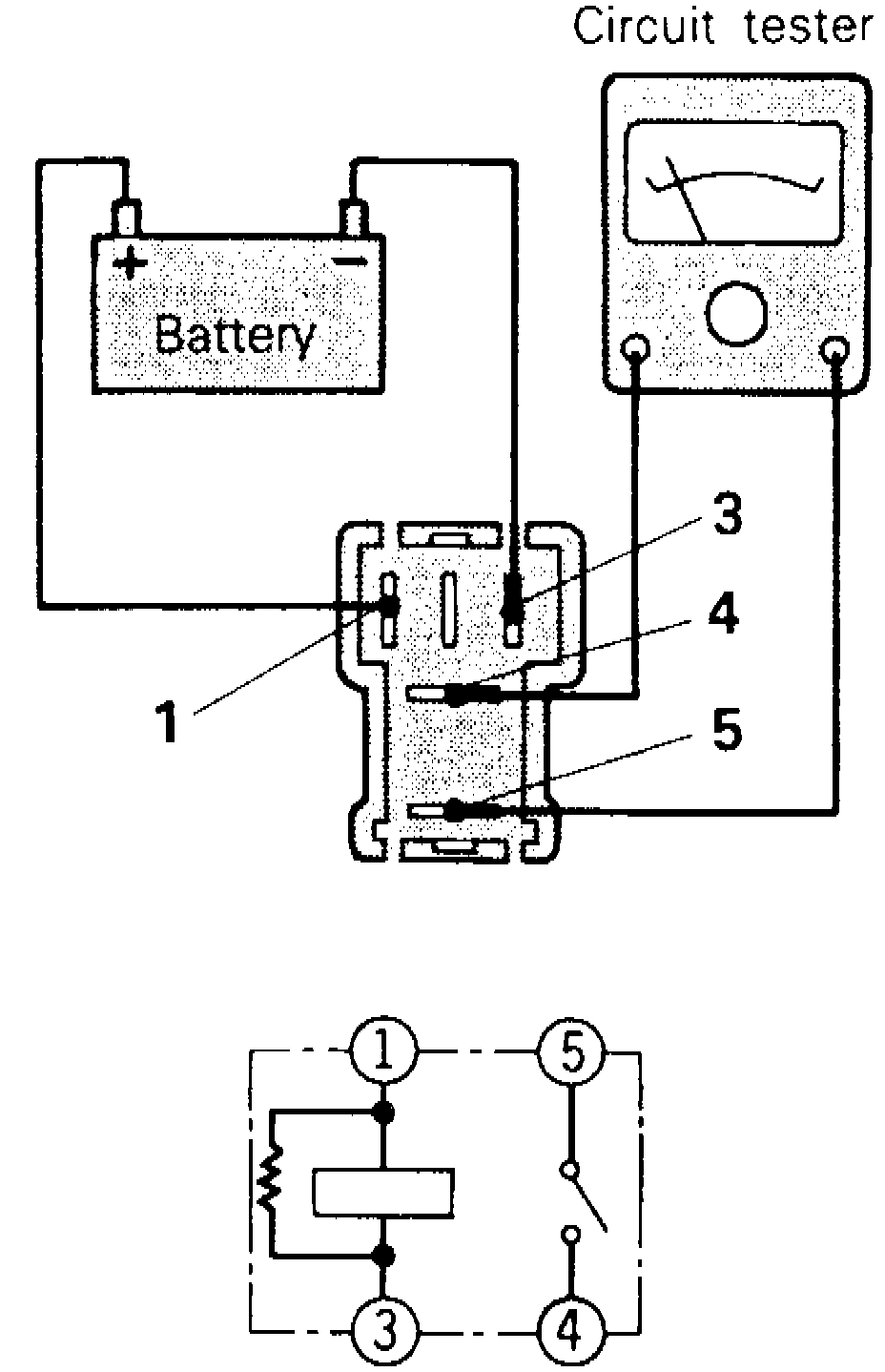 3. Connect battery positive to terminal 1 and battery negative to terminal 3, then check continuity between terminals 4 and 5 continuity should exist.