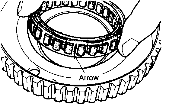 Push the one-way clutch into the outer race. Make sure that arrow on the outside circumference of cage is directed upward as shown in the illustration when the one-way clutch is pushed in.