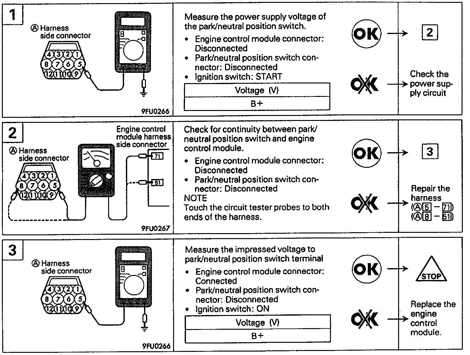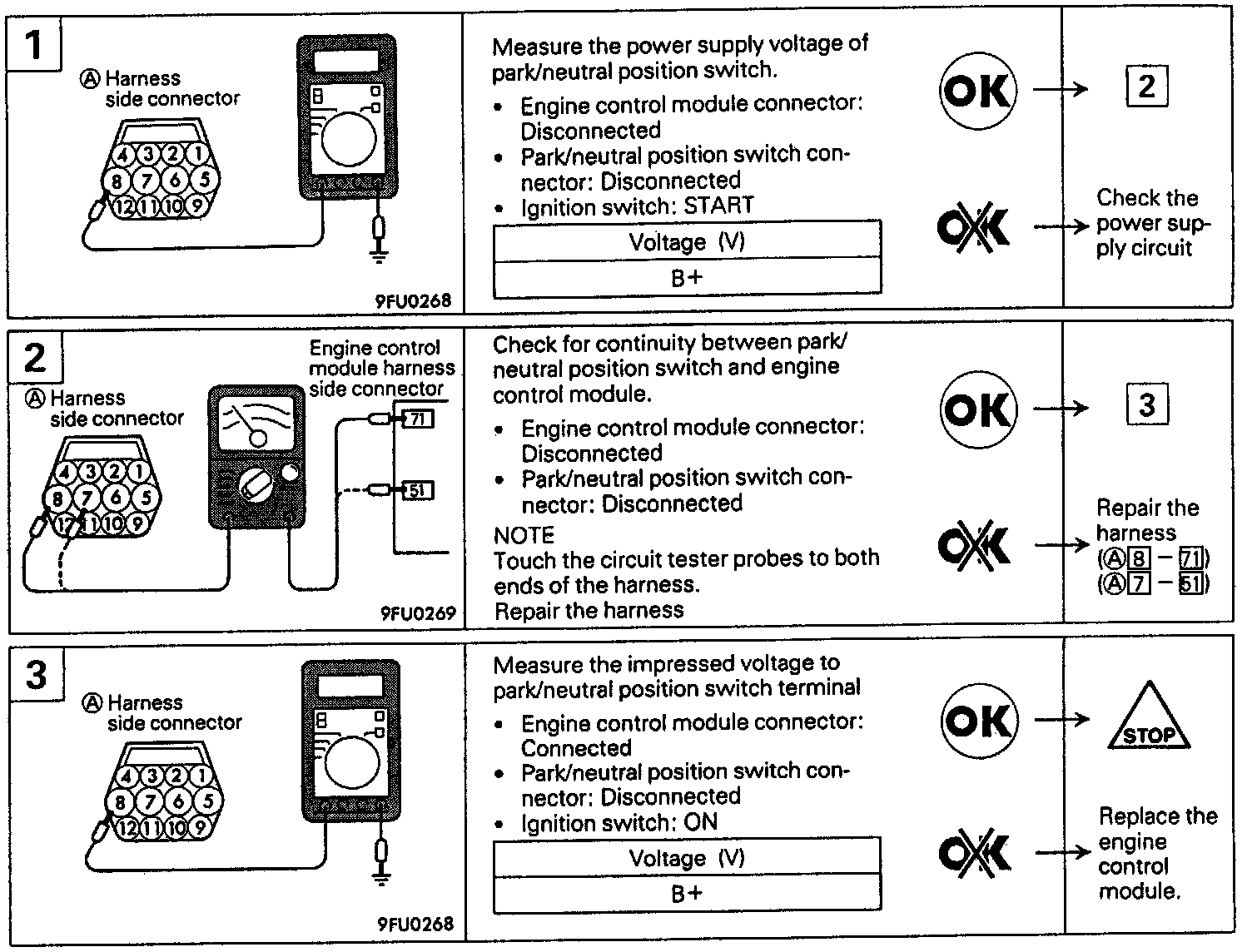 If the park/neutral position switch harness and individual part check have resulted normal but the park/neutral position switch output is abnormal, check control cable adjustment.