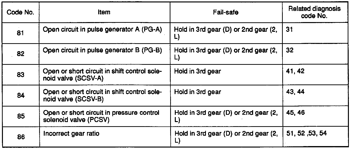 In addition, fail-safe codes lock the transaxle in 3rd or 2nd gear. Fail-safe will be cancelled if the ignition switch is turned OFF. the diagnostic trouble codes will remain.