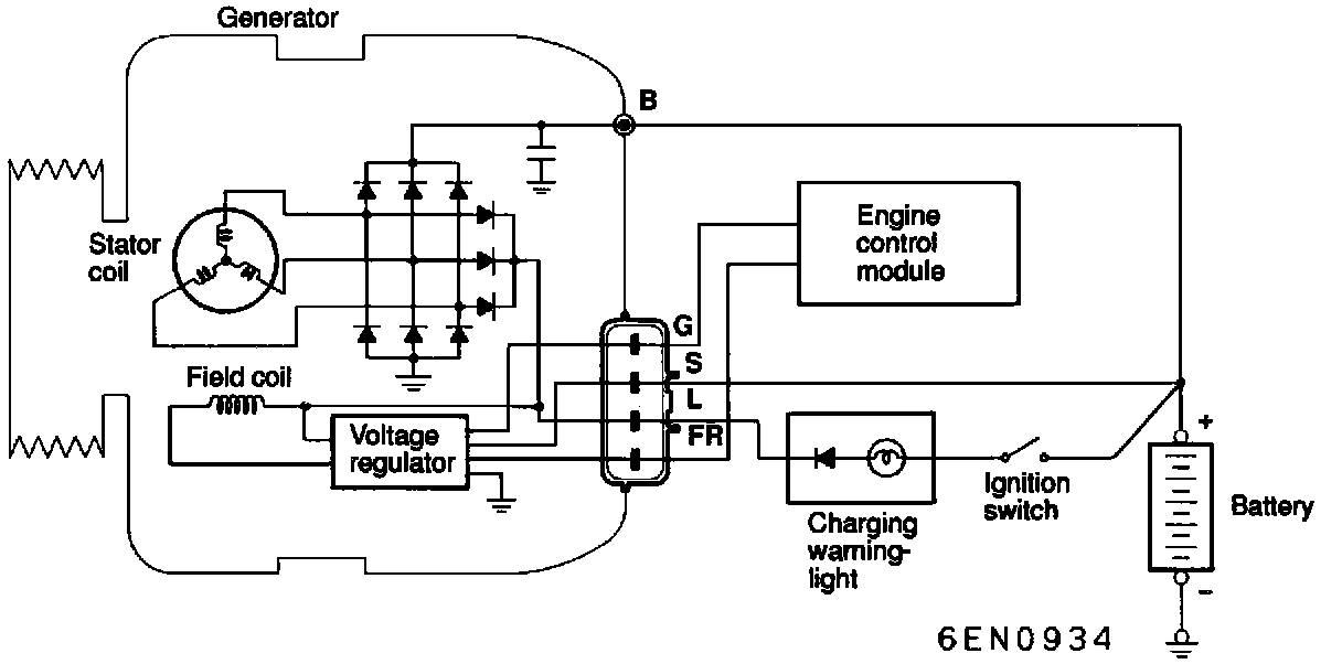 The generator output voltage rises as the field current increases and it falls as the field current decreases. When the battery voltage (generator S terminal voltage) reaches a regulated voltage of Approx. 14.4 V, the field current is cut off. When the battery voltage drops below the regulated voltage, the voltage regulator regulates the output voltage to a constant level by controlling the field current.
