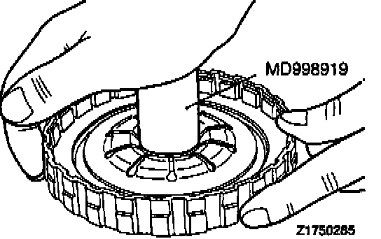 Check clearance between the snap ring and clutch reaction plate. To check the clearance, hold entire circumference of the clutch reaction plate down with 50 Nm (11 lbs.) force. If clearance is out of standard value, select a snap ring to obtain the standard value.