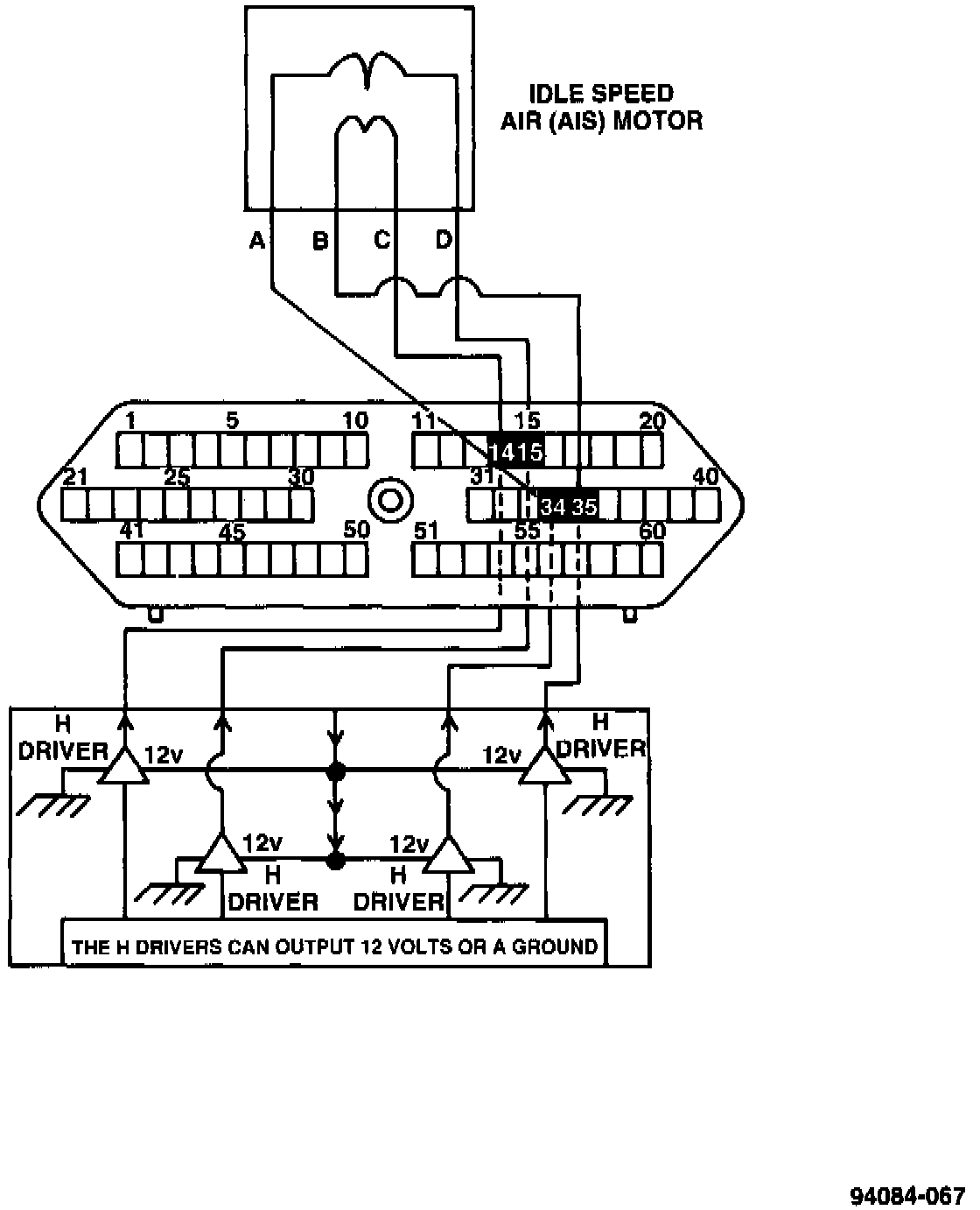 25 IDLE AIR CONTROL MOTOR CIRCUITS - (P 0505)The Idle Air Control (IAC) stepper motor is located on the throttle body. It is operated as a Powertrain Control Module (PCM) output through pins 14, 15, 34, and 35. The IAC is used to maintain engine RPM at idle, and as an off-idle load control (A/C compressor cycling). With the throttle plate completely closed, placing a load on the engine (A/C or power steering operation) might cause the engine to stall or run rough. As the PCM anticipates loads, it operates the IAC motor, opening the threatful bypass passage and allowing more air into the intake manifold. A malfunction of this system could cause rough idle and unstable emissions.