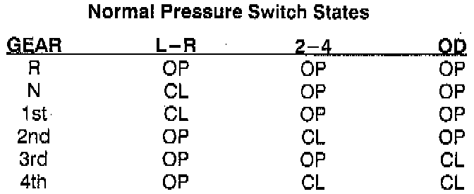 The transmission system uses three pressure switches to monitor the fluid pressure in the L-R, 2-4, and OD elements. The pressure switches are continuously monitored for the correct states in each gear as shown below: