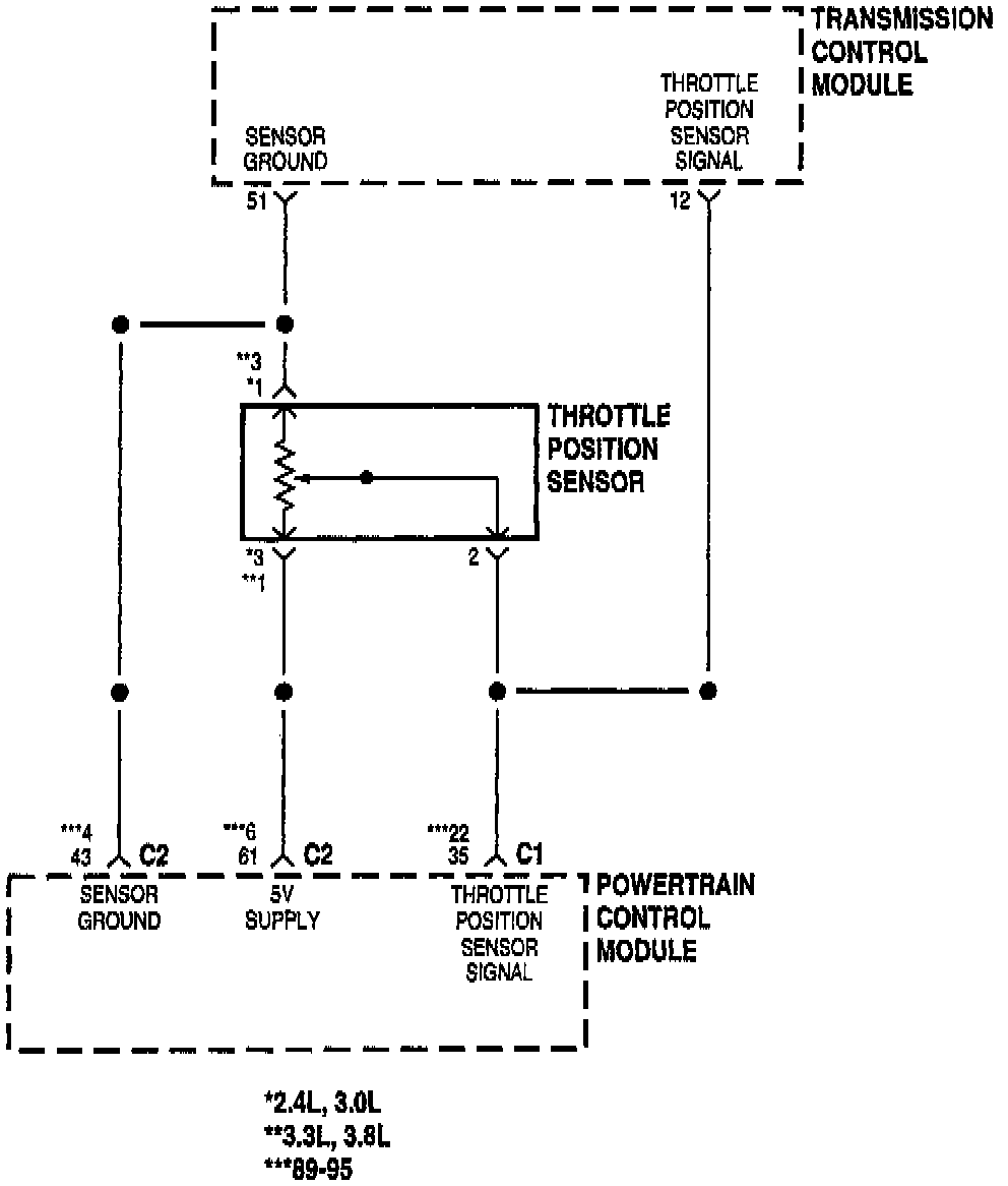 The Transmission Control Module (TCM) receives the throttle position from the Throttle Position Sensor (TPS). The TPS has a 5-volt pull up supplied from the Powertrain Control Module (PCM). The signal is checked for out of range as well as intermittents (excessive signal changes).