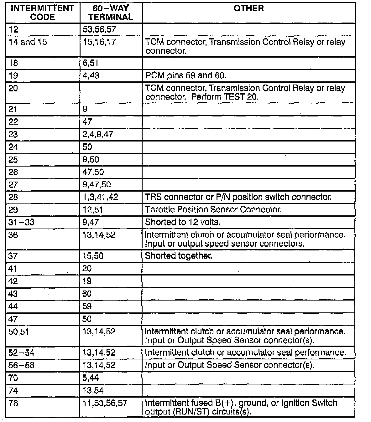2. If the above connections are in good condition, find the applicable intermittent code in the illustrated list. Carefully inspect the indicated terminals for damage.
