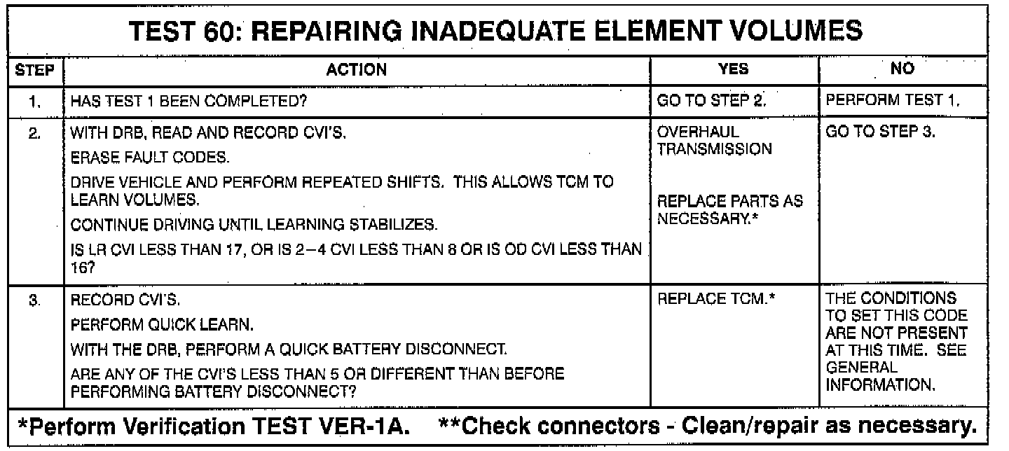 When doing a 2-1 or 3-1 coast down shift. Transmission temperature between 70 and 120°F. The appropriate code is set in less than 1 second if the updated learned volume is below a threshold value.
