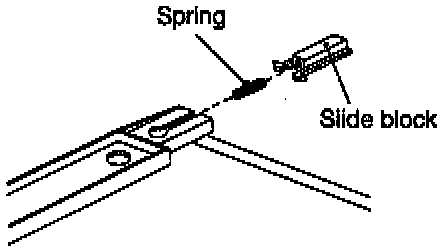 Squeeze together your fingers on inboard end of the slide block to allow the slide block to slide out of it's channel, and then remove the slide block and spring.