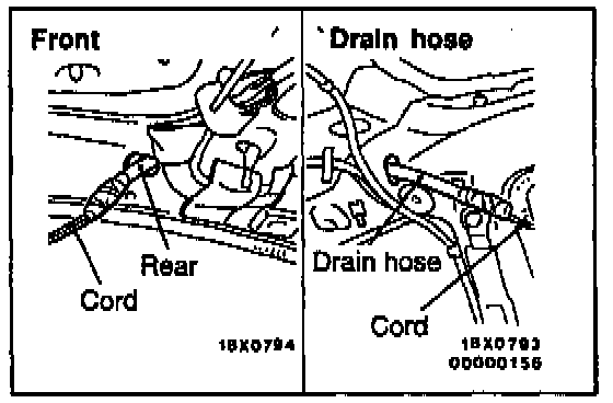 Remove the grommet Tie a cord to the end of the drain hose, wind plastic tape around it so that there is no unevenness, and pull the drain hose out into the wheel house.