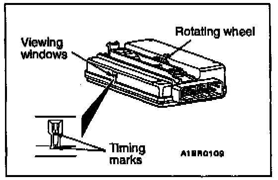 1. Look into the "viewing windows" while turning the rotating wheel. Turn the rotating wheel until the white timing marks appear. When the white timing marks appear in the "viewing windows" at the same time, stop turning the rotating wheel.