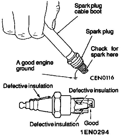 2. Ground the spark plug outer electrode (body), and crank the engine. Check that there is an electrical discharge between the electrodes at this time, and there is no defective insulation.