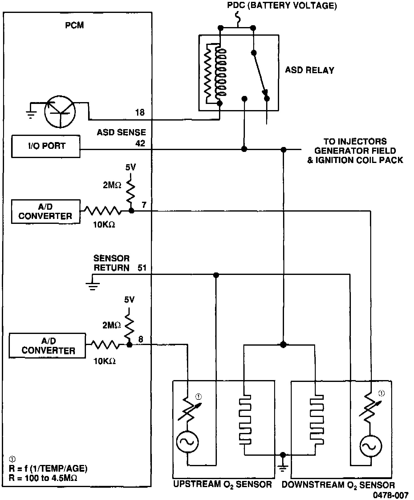 When the O2 sensor has cooled enough, the PCM energizes the Automatic Shut Down (ASD) relay for the next 48 seconds. With the relay energized, current should flow through the heater element causing an increase in temperature at the sensor. As the heater warms the O2 sensor, resistance of the O2 sensor's output circuit should decrease. As the resistance decreases, voltage at the PCM decreases. While the ASD relay is energized, the PCM pulses the 5-volt biased signal 30 times. Each time the biased voltage is activated, the PCM senses for a voltage drop. The O2 heater monitor test passes if the PCM detects at least 0.157 volt decrease in 15 out of the 30 pulsed signals.