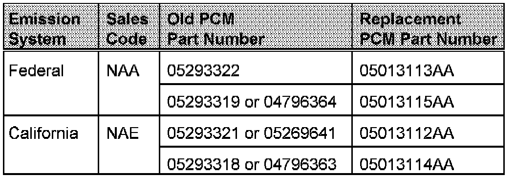 If the PCM part number for the vehicle that you are working on is NOT listed in the "Old PCM Part Number" column, it can be flash programmed to the replacement PCM part number. The only PCM's that require replacement are those listed in the "Old PCM Part Number" column.