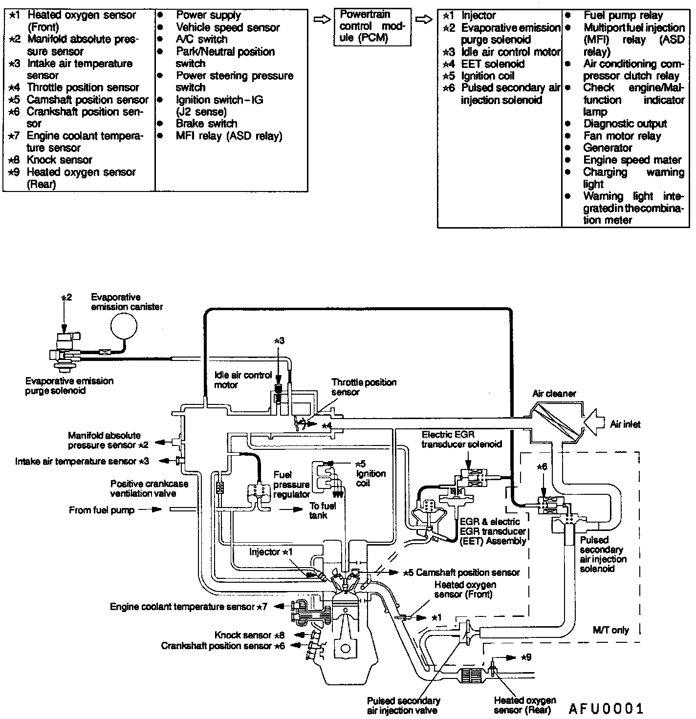 The Fuel Injection Control System consists of the Powertrain Control Module (PCM) and all of the engine and operating condition sensors. Using the information from the sensors to determine the proper fuel amount and delivery time, the PCM varies the injectors "ON" time to adjust the amount of fuel delivered during each individual firing cycle.