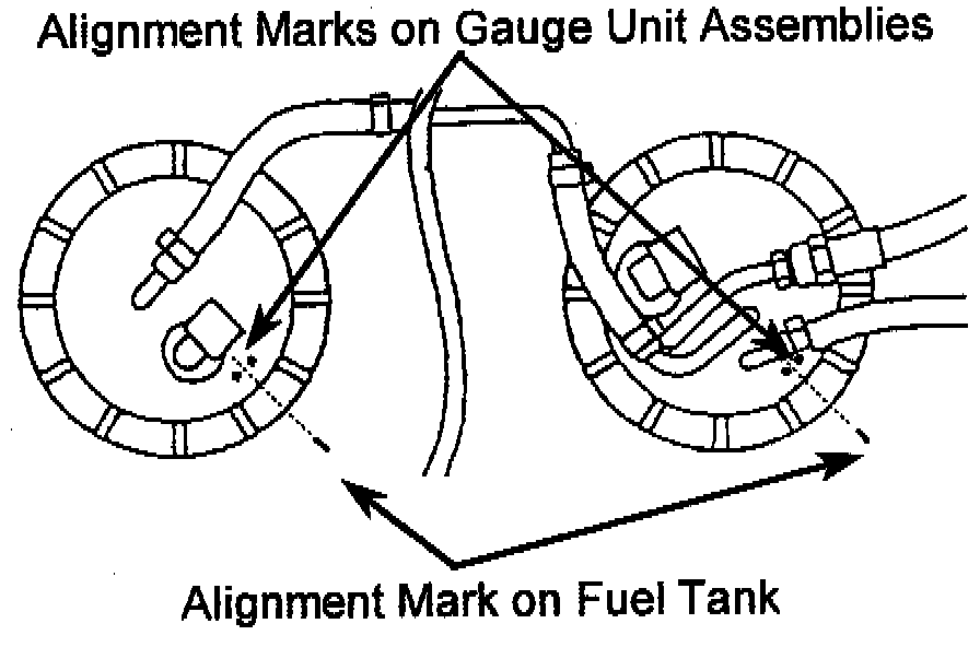 Fuel gauge unit/pipe assembly or fuel gauge unit/pump assembly must be aligned properly when service is performed to these units. Improper alignment will cause the fuel gauge to read incorrectly or not at all.