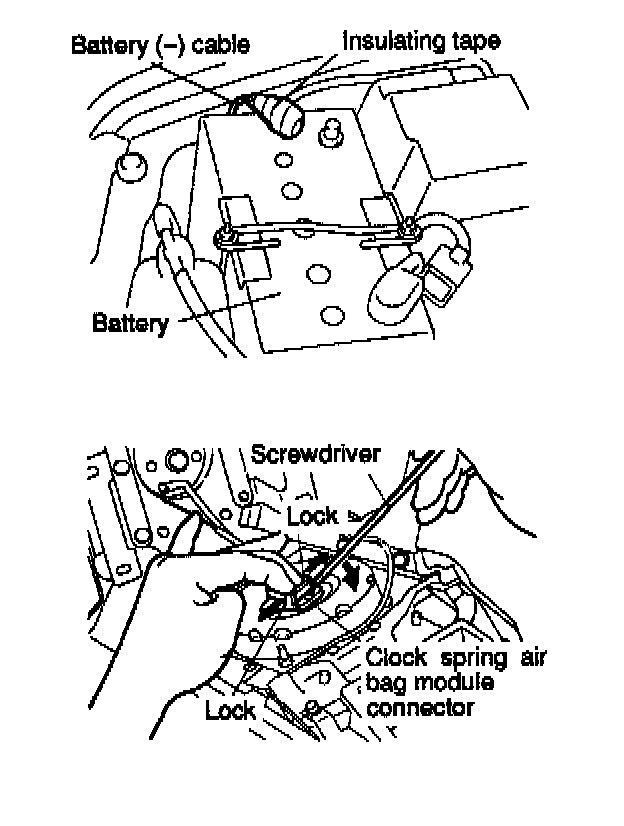 2. When disconnecting the connector of the clock spring from the air bag module, press the air bag's lock toward the outer side to spread it open. Use a screwdriver, as shown in the figure at the left, to pry so as to remove the connector gently.