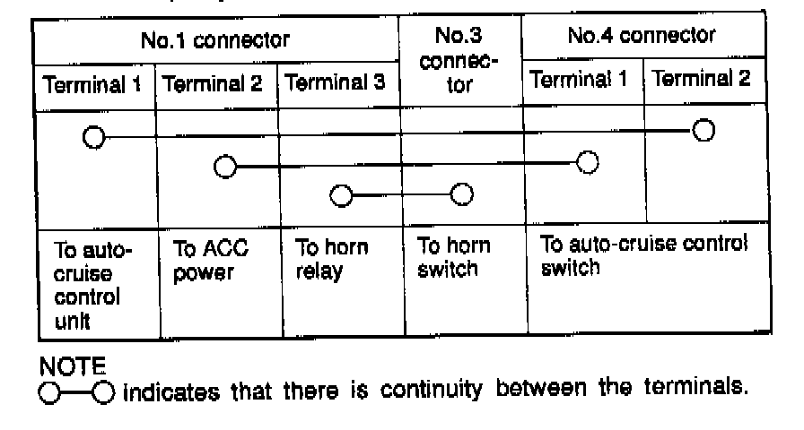 3. Check for continuity between the No.1 connector of the clock spring and connectors No.3 and 4