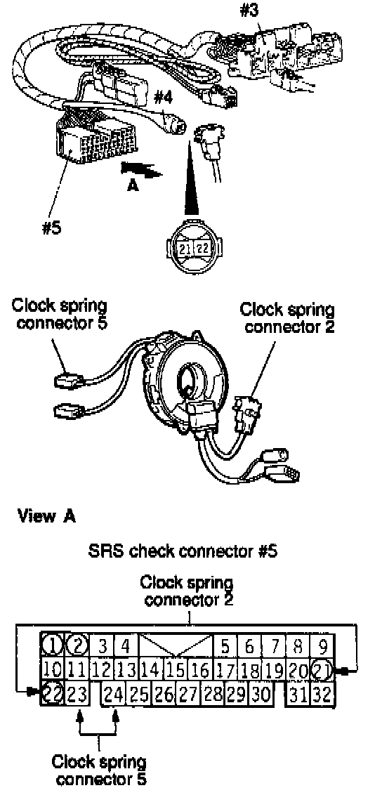 b. Check for continuity between terminal 1 and terminal 22, and terminal 2 and terminal 21, of SRS Check Harness connector # 5, using a digital multi-meter. Standard value: less than 0.4 ohms.