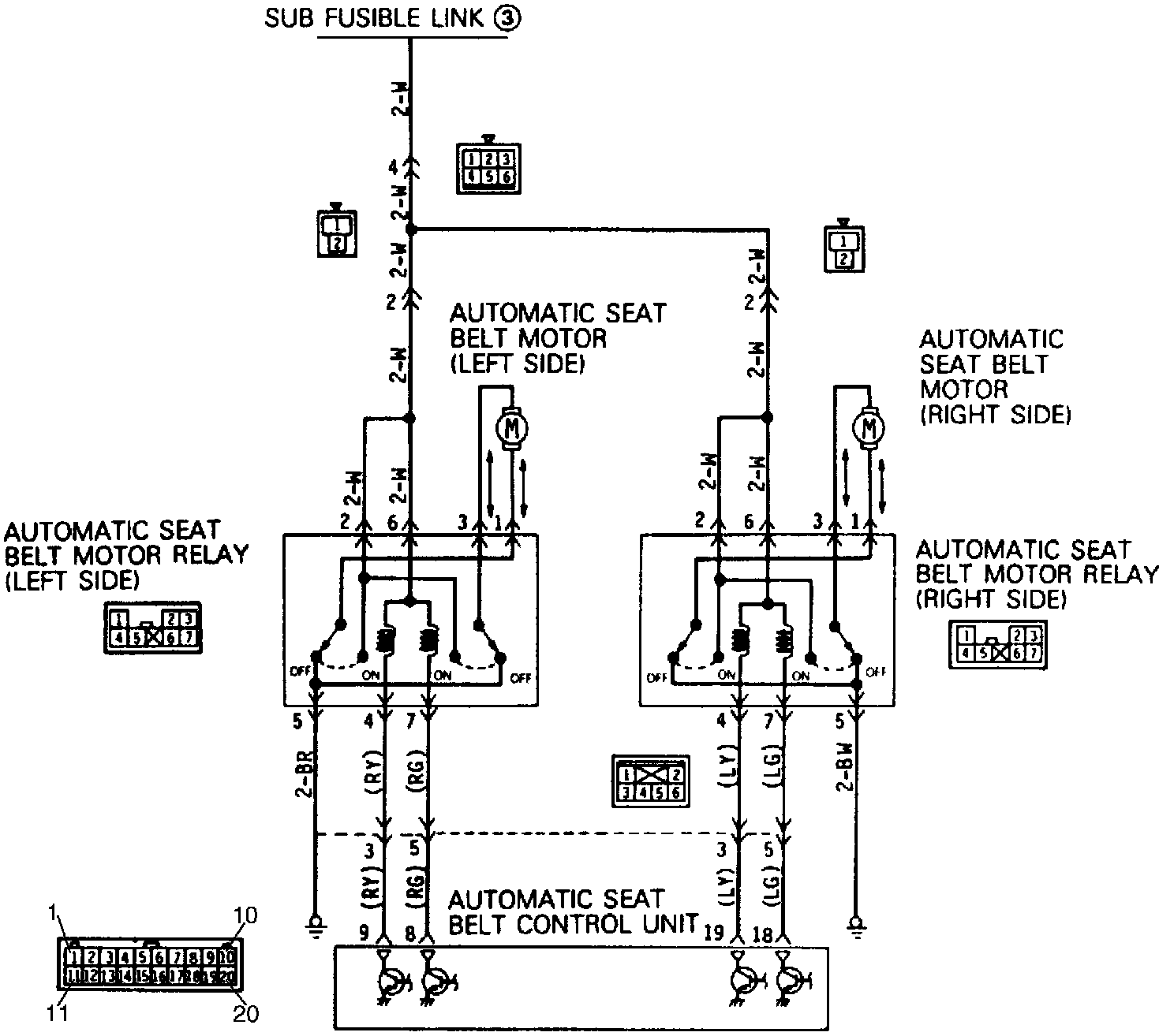 17. Connect voltmeter between control unit connector terminals 8, 9 and ground (left side), then between terminals 18, 19 and ground (right side).